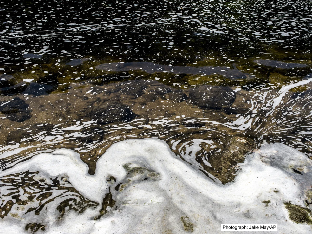 PFAS foam gathers at the the Van Etten Creek dam in Oscoda township, Michigan, near Wurtsmith Air Force Base.